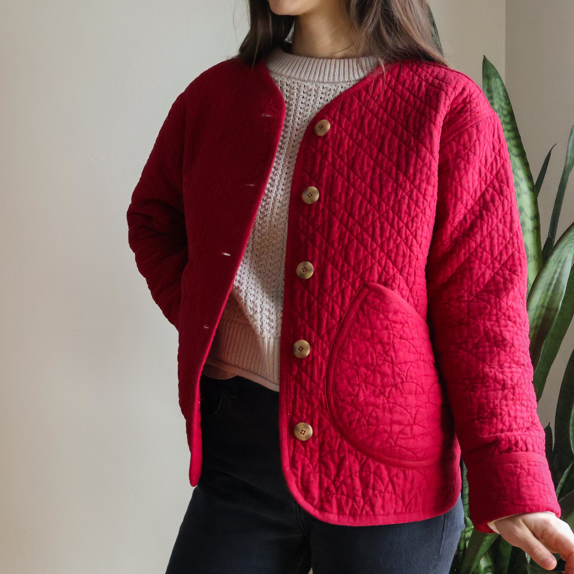 Crafted with care from a reclaimed crimson quilt, this coat is equally structured, down to earth and luxurious. Because of the quality of the blanket, this coat will feel stiff at first, but will break in beautifully, shaping to your body and softening with wear.
