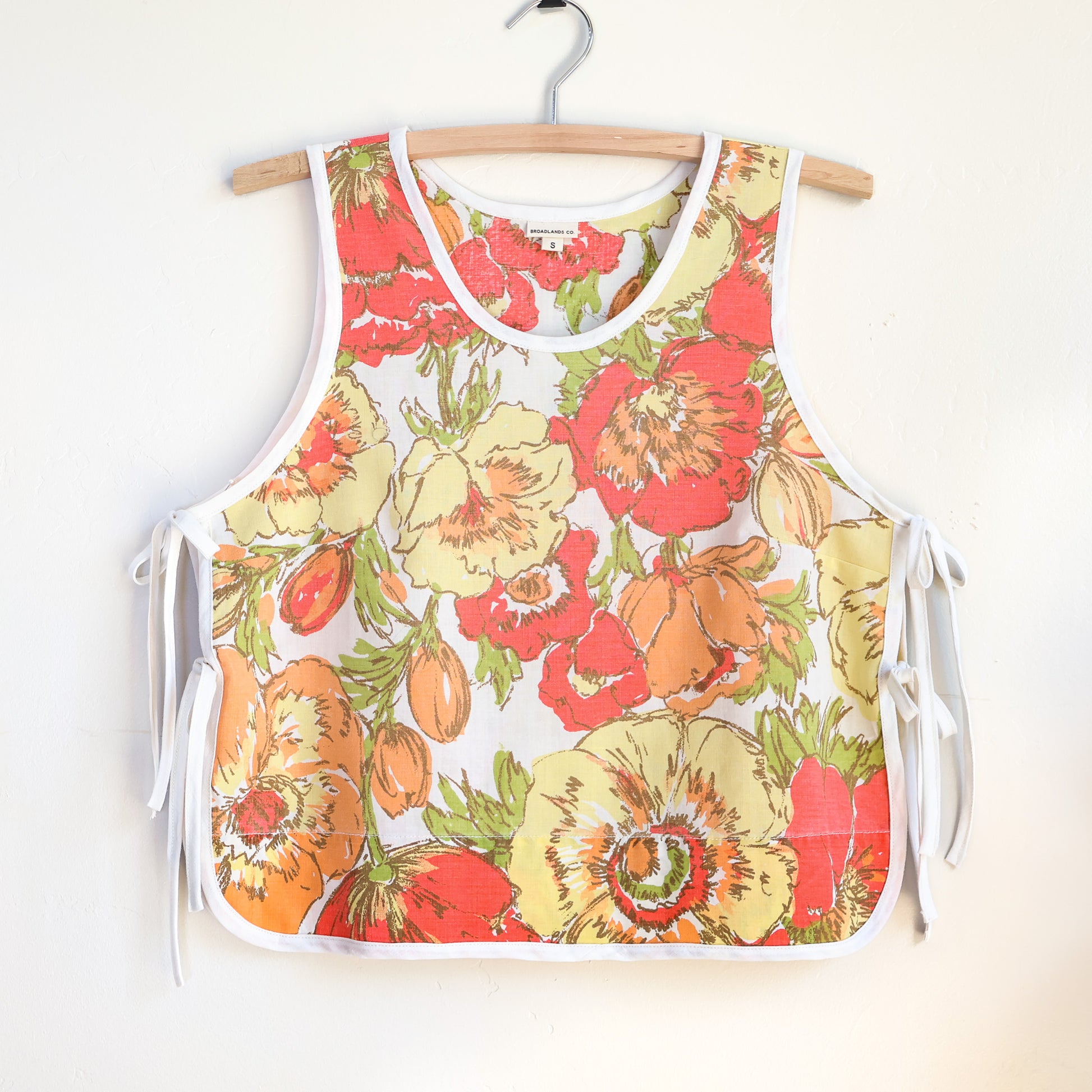 Lightweight and open at the sides, this easy layering vest is cut from a reclaimed sheet with bold floral peonies and soft binding around the edges. Two side ties offer an adjustable fit and relaxed shape. Designed to slip over your favorite summer dress or wear on its own.