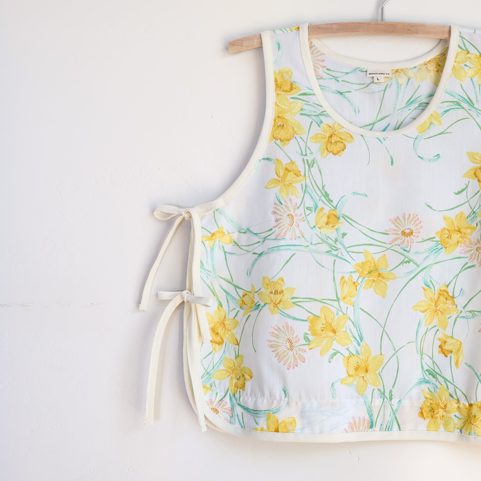Lightweight and open at the sides, this easy layering vest is cut from a reclaimed cotton floral sheet with delicate daffodils and soft binding around the edges. Two side ties offer an adjustable fit and relaxed shape. Designed to slip over your favorite summer dress or wear on its own.